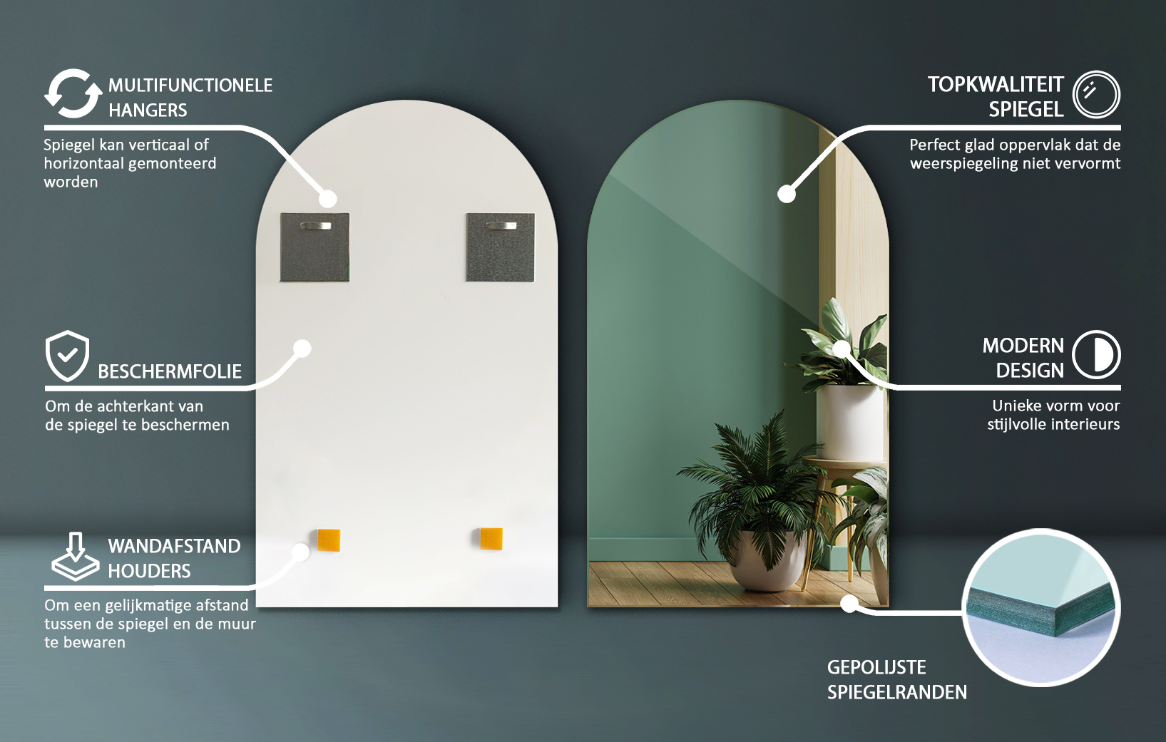 De Boogspiegel decoratief is een randloze, langgerekte boogspiegel die je interieur een vleugje originaliteit en lichtheid geeft. Dankzij het minimalistische ontwerp past hij moeiteloos in de slaapkamer, de woonkamer, de badkamer of de hal. Verkrijgbaar in formaten van 40×70 cm tot 60×100 cm, zodat je het perfecte formaat kunt afstemmen op de beschikbare muur en de gewenste uitstraling. Het frameloze design legt de focus op het spiegelvlak en sluit aan bij zowel klassieke als moderne interieurs.