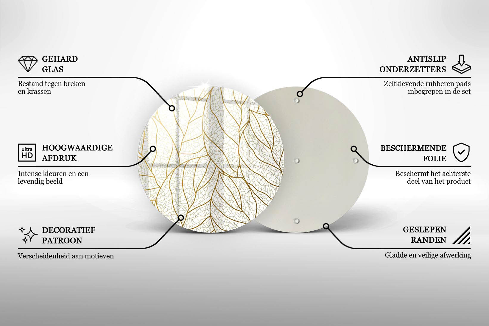 Deze stijlvolle glazen onderzetter is de perfecte oplossing voor wie zoekt naar een combinatie van duurzame bescherming en verfijnde decoratie. Kies voor zekerheid en esthetiek met een product dat jarenlang zijn kwaliteit behoudt.