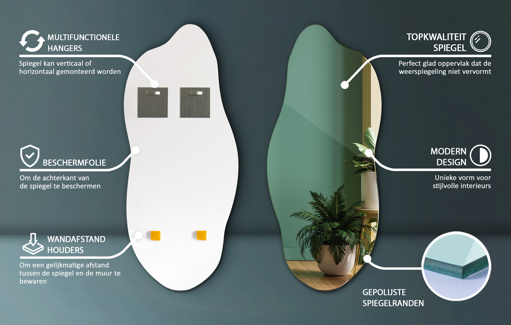 De Spiegel asymmetrisch modern wordt in Polen gemaakt, met aandacht voor detail en een verzorgde afwerking. De montage is eenvoudig dankzij metalen ophangbeugels en foam-afstandhouders, die voor stabiliteit en veiligheid zorgen. Zo geniet je snel van een nieuwe blikvanger die persoonlijkheid toevoegt aan woonkamer, hal, slaapkamer of badkamer — zonder het geheel te overheersen.